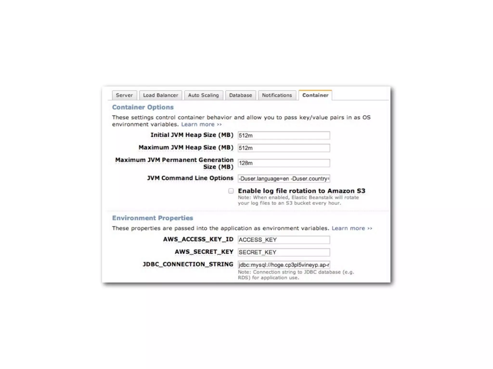namespace: ↲ aws:elasticbeanstalk:container:tomcat:jvmoptions option_name: Xmx value: 512m - option_name: AWS_SECRET_KEY value: SECRET_KEY - option_name: AWS_ACCESS_KEY_ID value: ACCESS_KEY