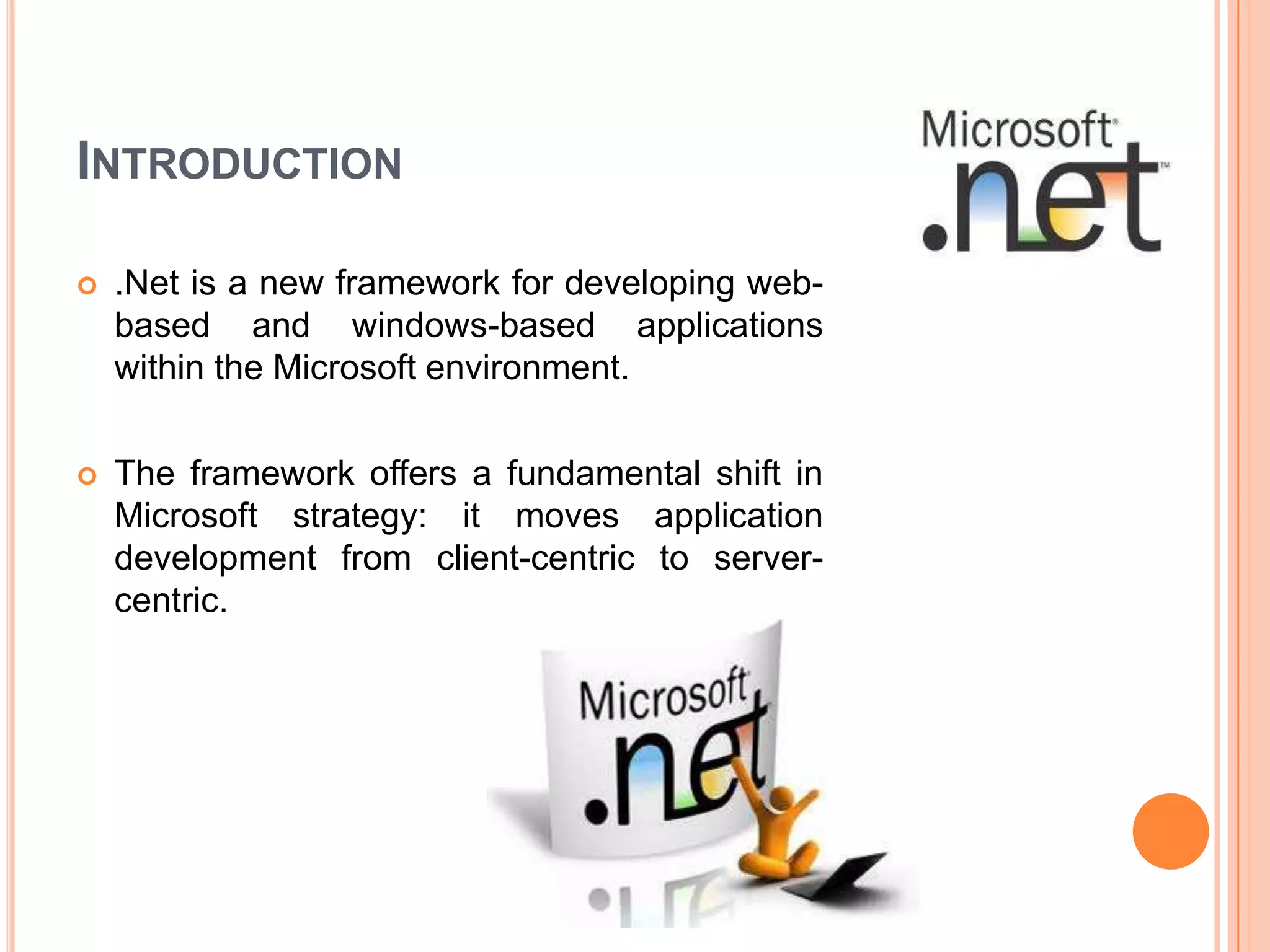 The document provides an overview of the .NET framework. It discusses that .NET is a development framework for building web and windows applications within the Microsoft environment. It moves application development from client-centric to server-centric. The framework includes the Common Language Runtime (CLR), Windows Forms, ASP.NET for web forms and web services, ADO.NET for data access, and Visual Studio.NET as the development tool. It supports multiple programming languages like VB, C#, C++ that compile to intermediate language code run on the CLR.