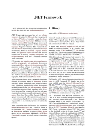 The .NET Framework is a software framework developed by Microsoft that runs primarily on Windows. It includes a large class library and provides language interoperability across programming languages. Programs written for .NET execute in the Common Language Runtime (CLR), which provides services like security and memory management. The .NET Framework includes versions for mobile devices and supports multiple programming languages that compile to an intermediate language and are then compiled to native code when executing.