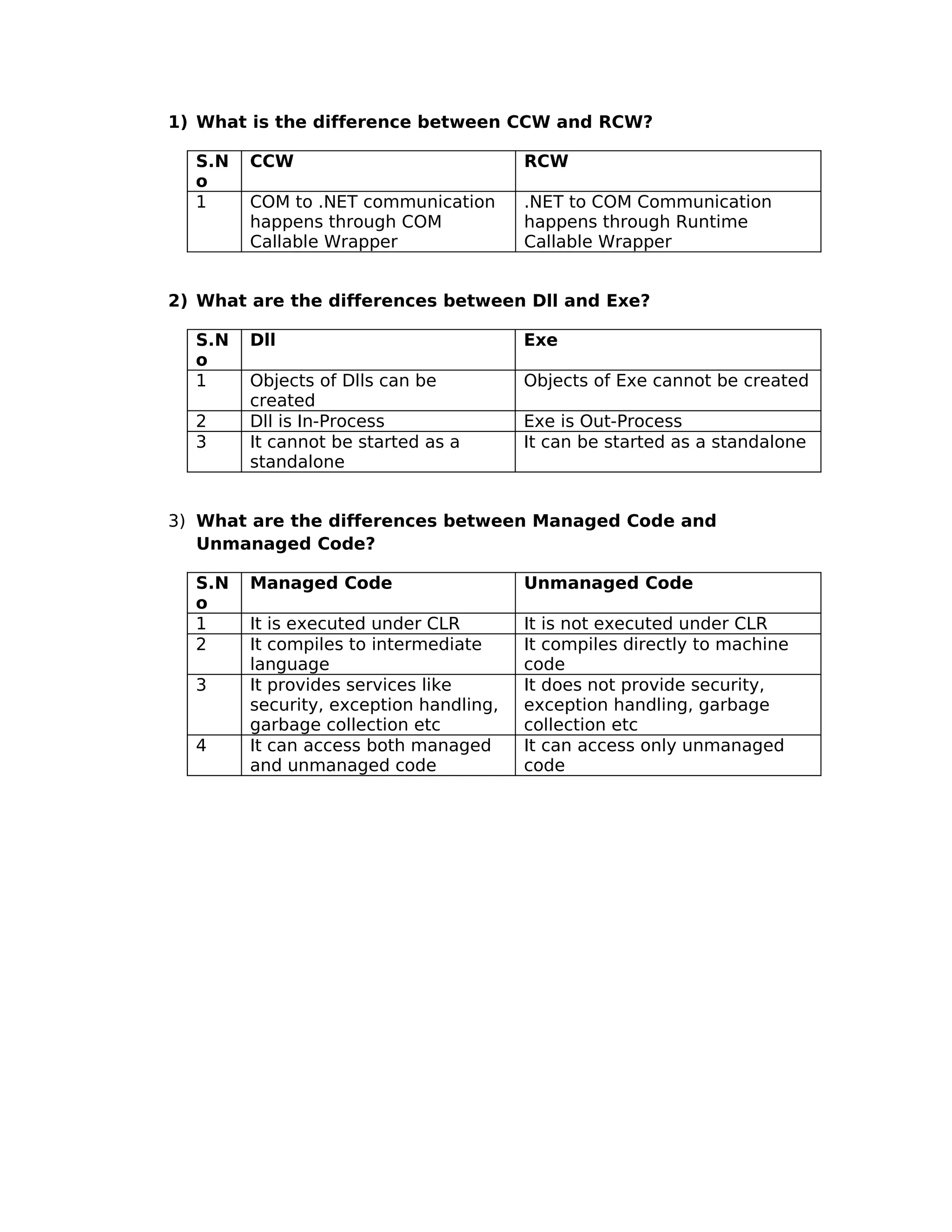 The document outlines the differences between CCW and RCW, DLLs and EXEs, and managed and unmanaged code. CCW is used for COM to .NET communication while RCW is for .NET to COM. DLLs allow object creation and are in-process while EXEs do not allow object creation and are out-of-process. Managed code runs under CLR, compiles to intermediate language, and provides services like security while unmanaged code does not run under CLR, compiles directly to machine code, and does not provide those services.