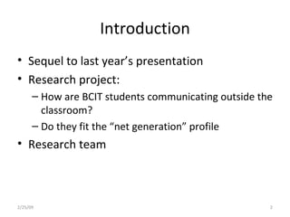 The document explores the communication behaviors of BCIT students in relation to the 'net generation' characteristics, investigating how their technology use affects their learning. While the findings suggest that BCIT students are digitally literate and comfortable with certain technologies, they do not strongly fit the net generation profile, indicating that contextual factors may play a more significant role than generational ones. The authors conclude that understanding student needs and learning contexts is essential for effective educational practices.