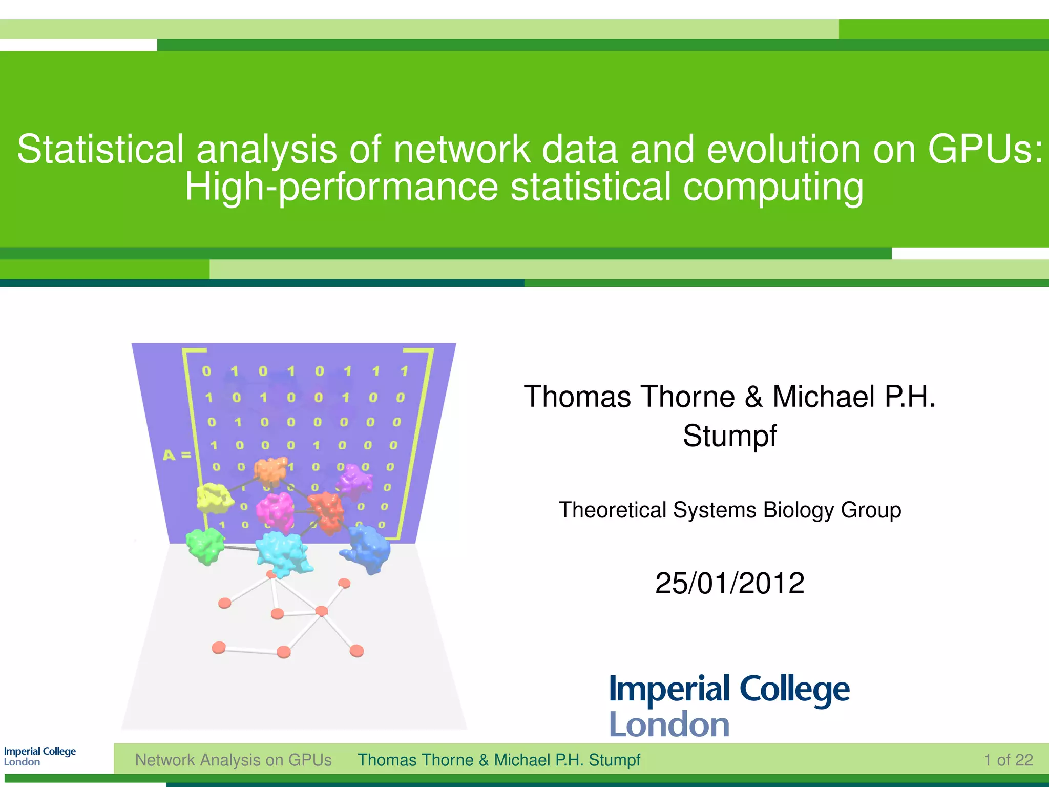 The document discusses the statistical analysis of network data and its evolution on GPUs, highlighting their advantages in high-performance computing due to lower energy requirements and flexibility across programming languages. It explores the complexities of network evolution models and how various methodologies, such as approximate Bayesian computation, can be employed to summarize and evaluate network structures. Challenges in using GPUs for computational statistics are addressed, including their original design for gaming applications, which may conflict with the needs of statistical analysis.
