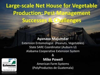 The document discusses the implementation and effectiveness of large-scale net houses for vegetable production in Alabama, highlighting their role in pest management and challenges faced, particularly for organic farmers. It presents past research demonstrating the efficacy of net houses in reducing insect pest populations and the associated reduction in insecticide use. Additionally, it outlines the construction and initial outcomes of a net house in Baldwin County, Alabama, while identifying future research needs related to heat stress, disease management, and pest control strategies.