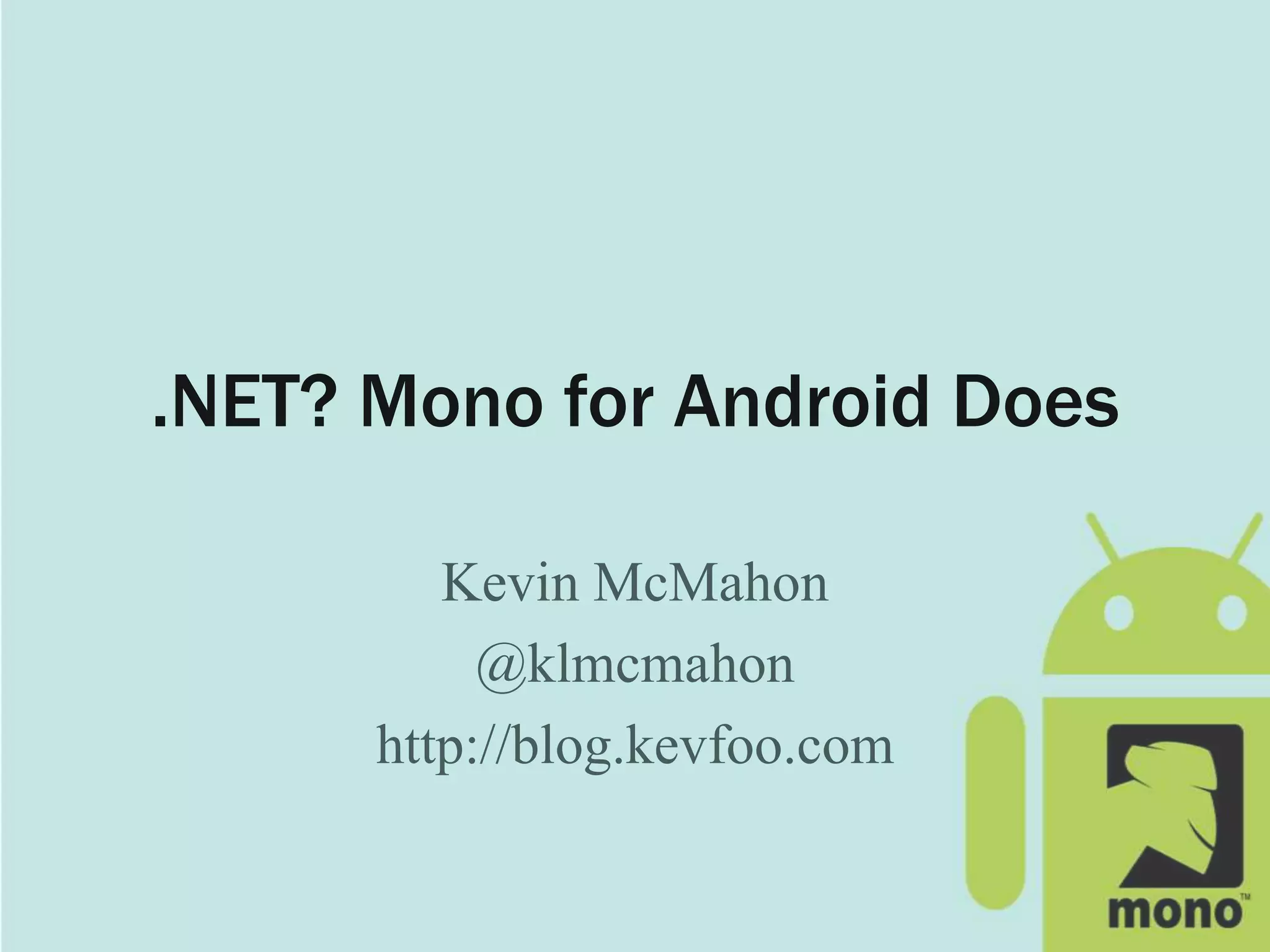 This document provides an overview of Mono for Android, which allows developers to use C# and the .NET framework to build Android applications. It discusses Android concepts like activities, services, and intents. It also explains how Mono for Android works by using a Mono runtime and proxies to interface with the Android framework from managed code. Benefits of Mono for Android include code reuse across platforms, using C# and Visual Studio for development, and the ability to eventually sell applications on marketplaces.