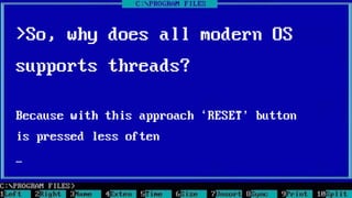 This document discusses multithreading and concurrency in .NET. It covers key concepts like processes and threads, and how they relate on an operating system level. It also discusses the Thread Pool, Task Parallel Library (TPL), Tasks, Parallel LINQ (PLINQ), and asynchronous programming patterns in .NET like async/await. Examples are provided for common threading techniques like producer/consumer and using the Timer class. Overall it serves as a comprehensive overview of multithreading and concurrency primitives available in the .NET framework.