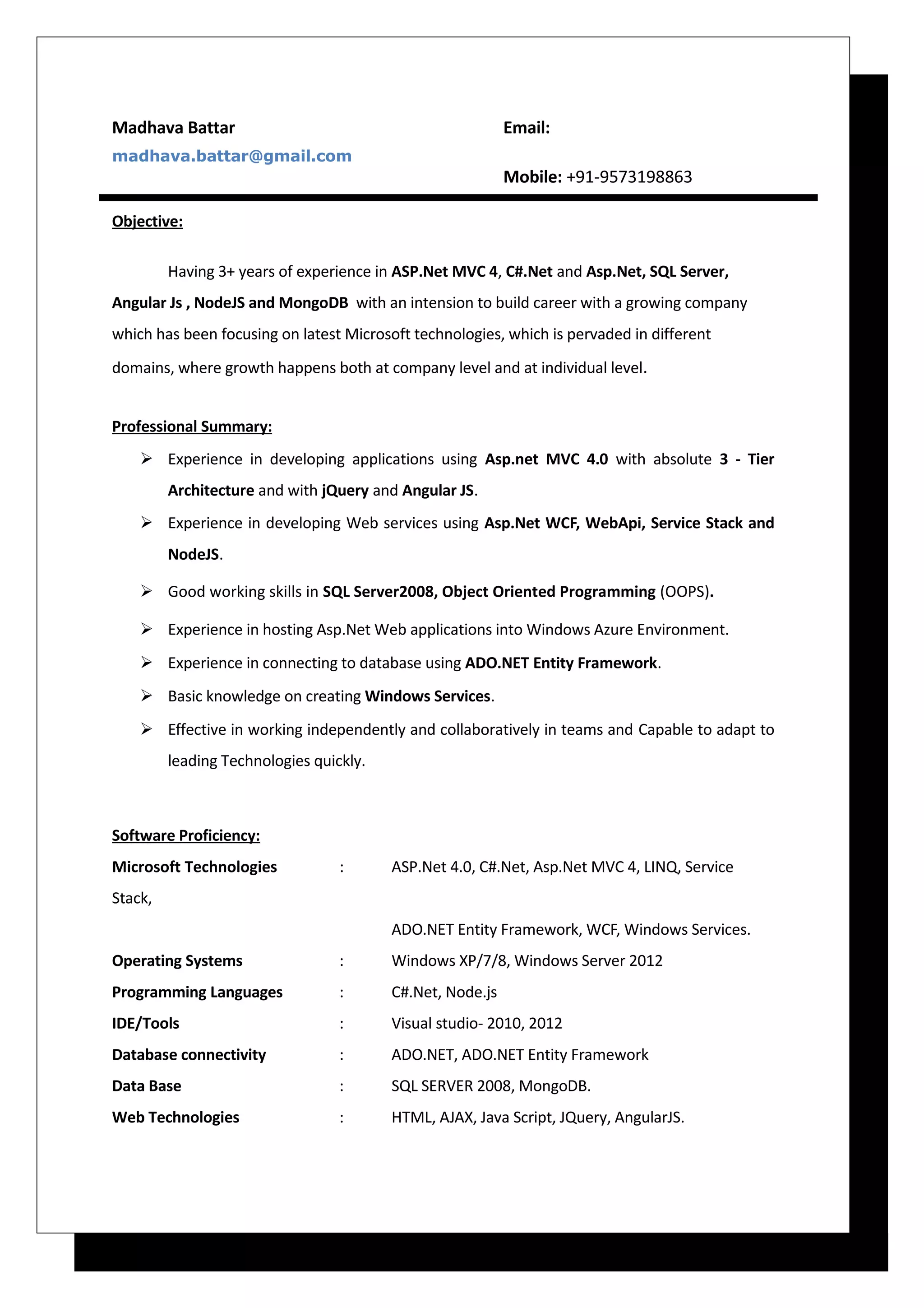 Madhava Battar has over 3 years of experience developing web applications using technologies like ASP.NET MVC, C#, AngularJS, and SQL Server. He has worked on projects in various domains including healthcare, travel, and business management. Currently employed as a Software Developer, Madhava is self-motivated and able to work independently as well as collaboratively on a team. He aims to further his career with a growing company focused on latest Microsoft technologies.