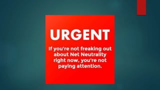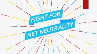 Net neutrality is the concept of equal access to the internet without bias toward certain content. It has been a guiding principle since the inception of the internet. However, internet service providers want to charge content providers more for certain network traffic or services. Without net neutrality protections, ISPs could control and restrict access to websites and increase costs. Supporters argue this would fundamentally change the open internet, while ISPs say it is needed to sustain network infrastructure. There is an ongoing conflict between preserving net neutrality regulations and allowing ISPs to manage their networks.