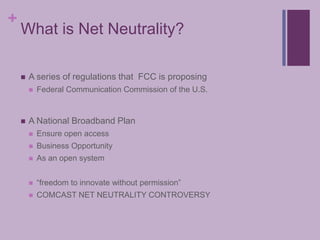 The document discusses net neutrality, emphasizing its importance for ensuring equal access to internet content and fostering innovation without excessive regulation. It outlines the Federal Communication Commission's proposals and various challenges, such as high implementation costs and potential risks of government overreach. The document also suggests possible solutions to promote a free market and a self-regulated internet while balancing the needs of providers and users.
