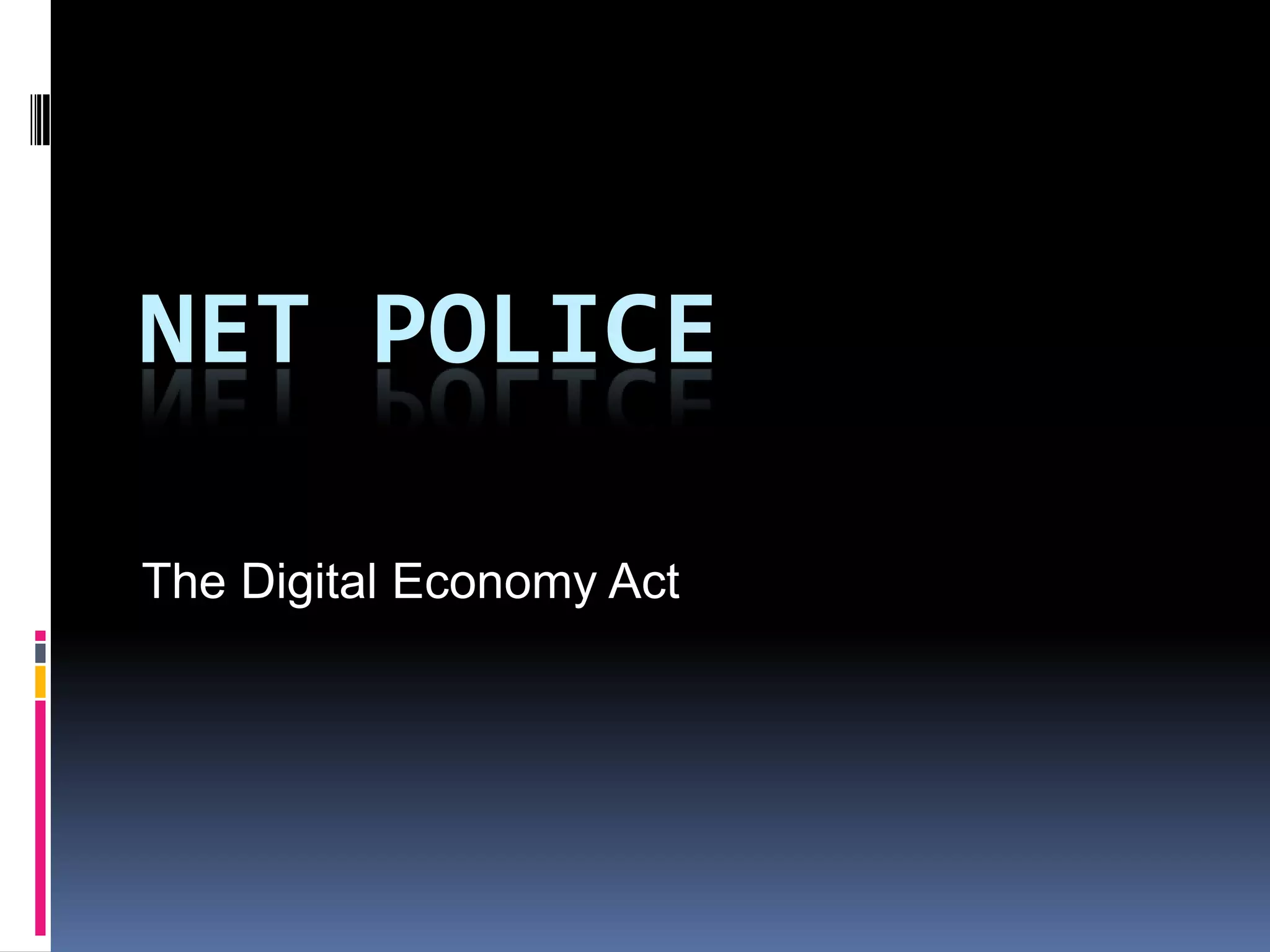 The Digital Economy Act allows for monitoring of internet activity to catch illegal file sharing. Those caught illegally downloading face consequences that start with a warning letter and can escalate to slowing down or temporarily suspending internet access. This is an attempt to stop losses in the music industry due to illegal downloading. However, others argue that file sharing can help artists by exposing more people to their music and that it may encourage future legal purchases or funding. The outcomes are uncertain, as illegal downloading may just shift rather than stop, and internet providers could lose business.