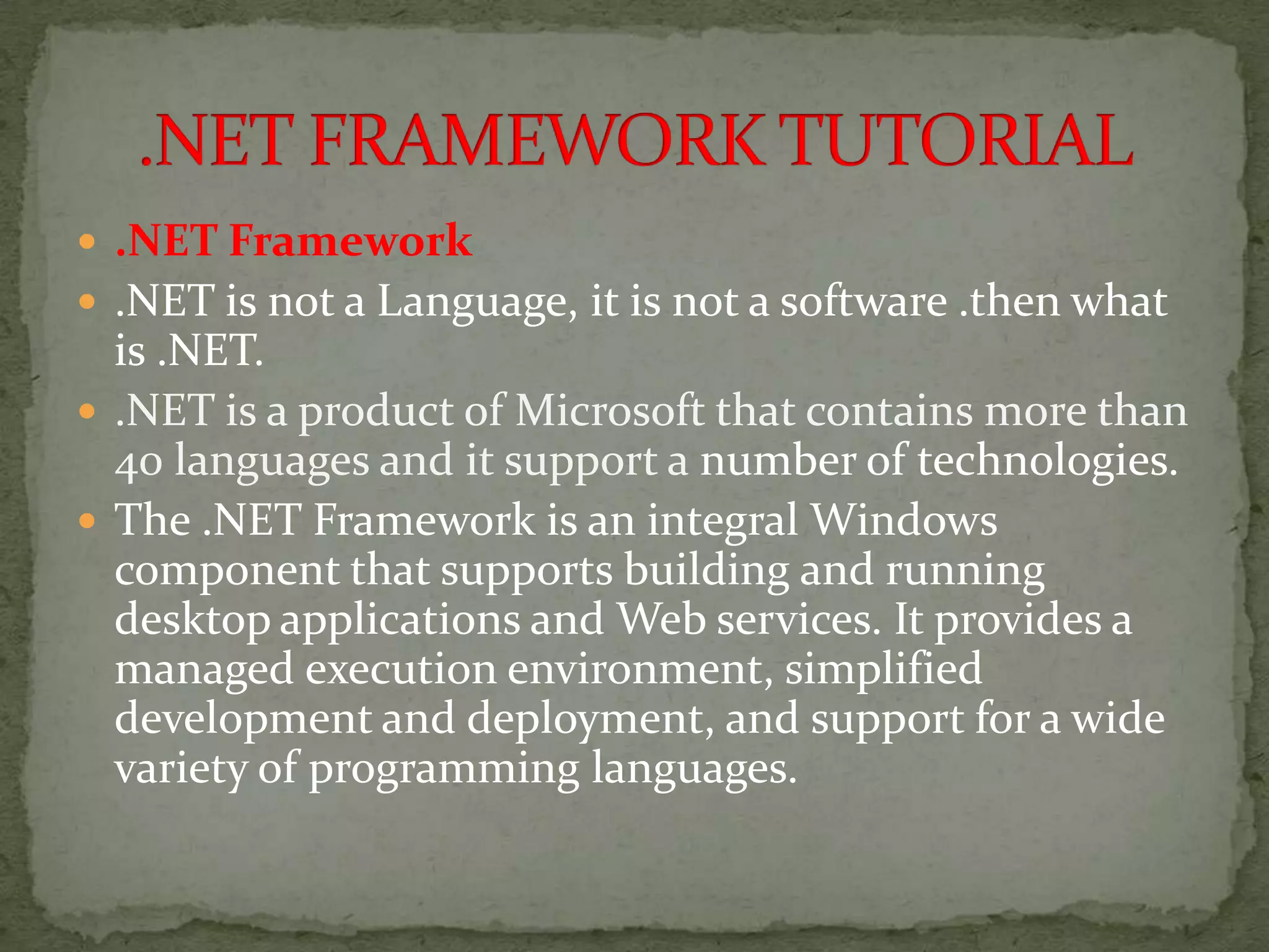 The .NET Framework is a development platform created by Microsoft that includes a common language runtime (CLR) and class libraries. The CLR manages memory and executes code, while the class libraries provide functionality for building various types of applications. Key components of the .NET Framework include the CLR, class libraries, ASP.NET for web development, and languages like C# and VB.NET that compile to the intermediate language used by the CLR.