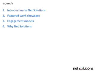 Net Solutions is an offshore development partner that has been in business for over 13 years. They provide outsourced product development, UX, mobile, and web development services to enterprise customers across various industries. They have a large facility and staff of over 175 employees. Some of their areas of expertise include UI/UX, web development, mobility, cloud/SaaS, and CMS platforms like Drupal, Kentico and Sitecore. They showcase some of their featured work including projects involving e-commerce, retail, education and more.