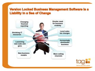 TeamTag has been assisting companies with the selection and implementation of business applications such as ERP, CRM, and HRIS since 1995. The document compares older ERP technologies, which suffer from integration and accessibility issues, with newer cloud-based systems that offer real-time data and broader functionality. CPA professionals can leverage these advanced tools to enhance client relationships through real-time insights and automated processes.