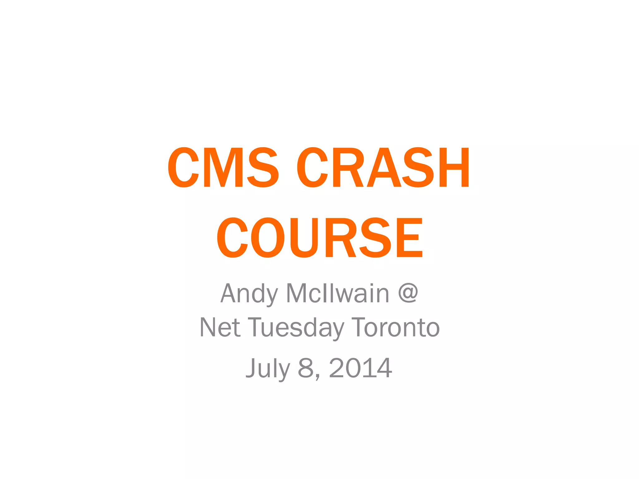 The document outlines a crash course on content management systems (CMS) presented by Andy McIlwain, detailing what a CMS is and why it's important. It emphasizes the necessity of defining requirements and stakeholders before choosing a CMS and compares various CMS platforms, highlighting their pros and cons. Key considerations include functionality, design, content management, system requirements, and available support.