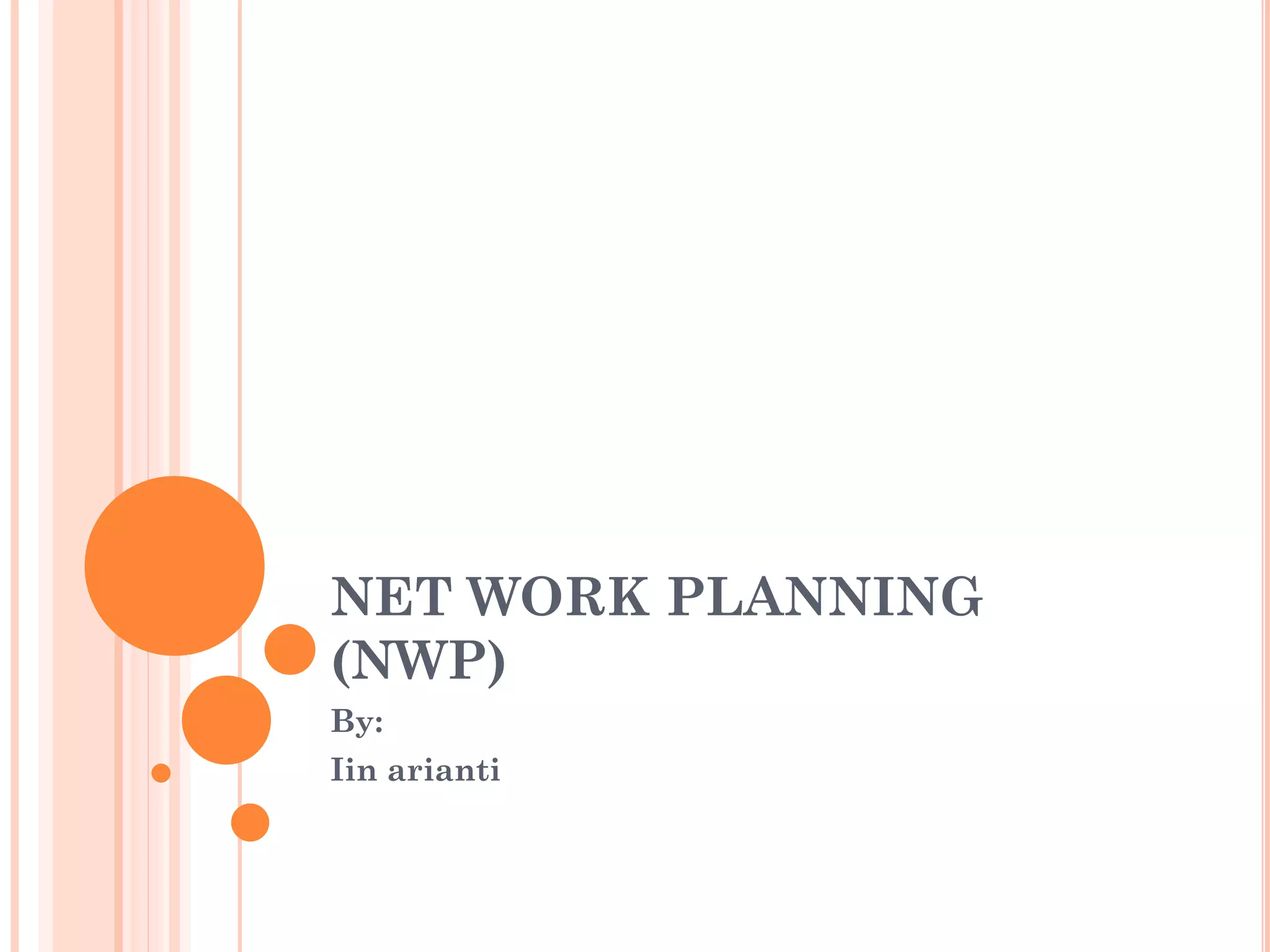 Network Planning (NWP) adalah metode yang dikembangkan untuk mengendalikan kegiatan kompleks dalam proyek, memfasilitasi monitoring dan tindakan koreksi melalui pembaruan jadwal. Metode ini menggambarkan ketergantungan antar kegiatan melalui arrow diagram dan menyediakan analisis untuk meningkatkan efisiensi proyek, baik dalam aspek biaya maupun waktu. NWP juga membantu dalam mengidentifikasi jalur kritis yang menentukan waktu penyelesaian proyek.