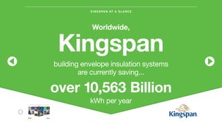 Kingspan is a global manufacturer of high performance building systems and insulation solutions. They have over 50 years of experience and their insulation systems currently save over 10,563 billion kWh of energy per year, equivalent to significant reductions in CO2 emissions, oil consumption, and more. Kingspan promotes an "EnvelopeFirst" approach to net-zero energy buildings, where high-performance insulation of the building envelope is the first and most cost-effective step, followed by energy efficiency measures, integrated renewables, and ultimately net-zero energy use from highly efficient buildings.