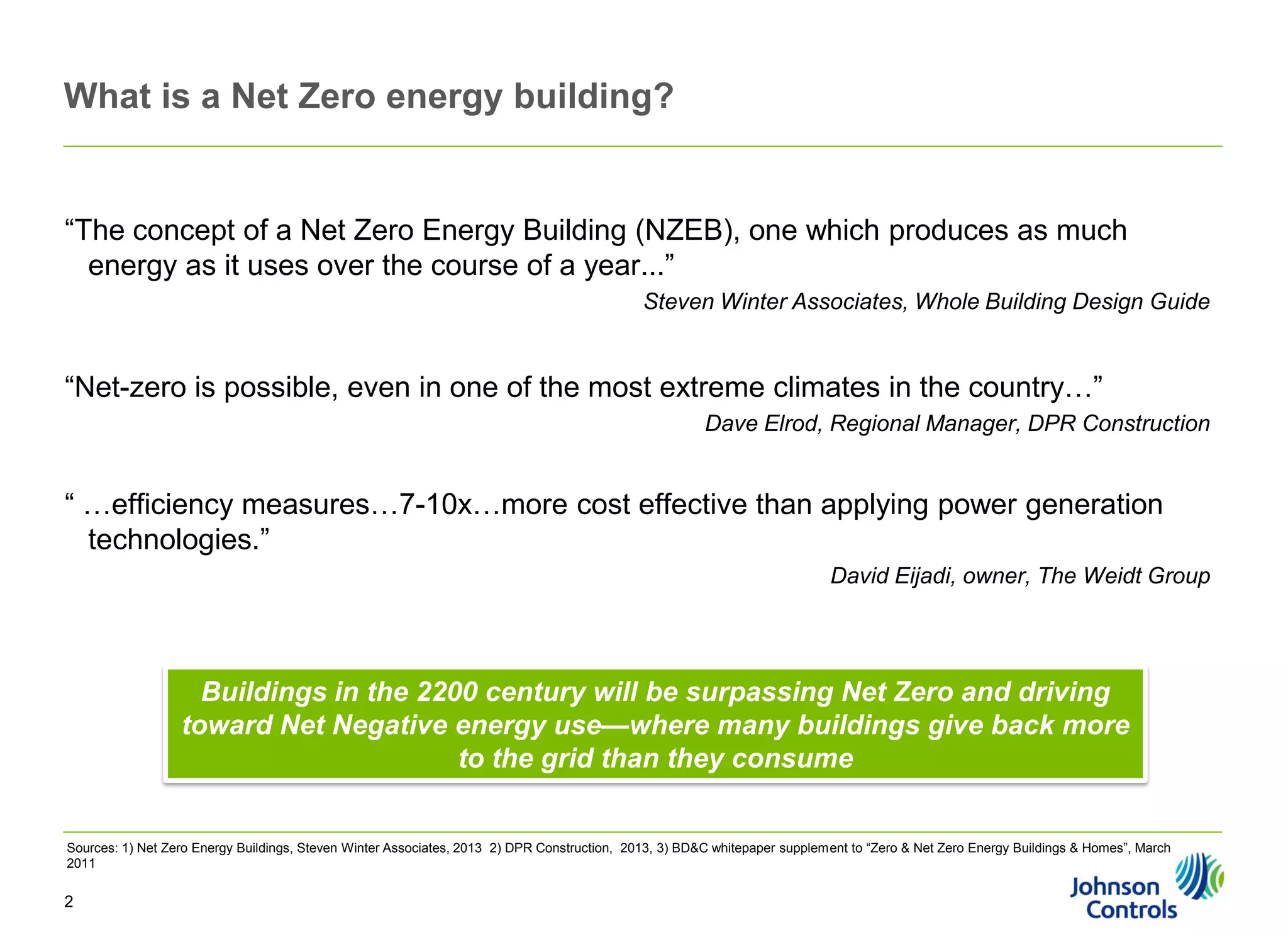 The document discusses the concept of net zero energy buildings (NZEB), highlighting the goal of these buildings to generate as much energy as they consume over a year. It outlines energy consumption patterns in commercial buildings, emphasizing the need for improved efficiency with reference to various initiatives and standards aimed at decreasing energy intensity by 2030. Key technologies and integrated design approaches are identified as crucial to achieving significant reductions in energy usage and transitioning towards net negative energy buildings.