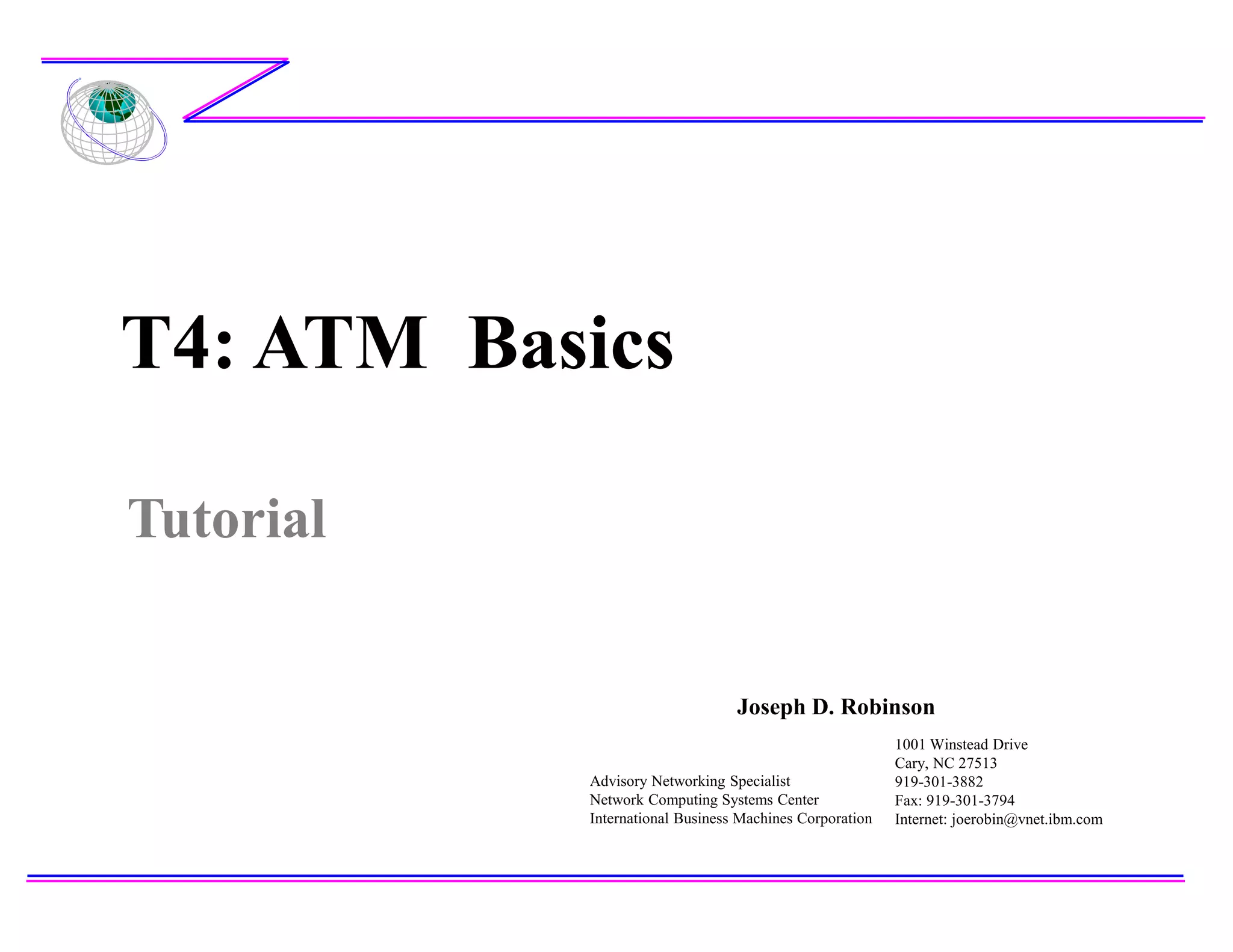Joseph D. Robinson is an Advisory Marketing Support Representative at the IBM Network Computing Systems Center in Cary, North Carolina. He has implemented both Classic IP and ATM LAN Emulation products for the past 4 years, including various IBM ATM switches, routers, and bridges. The document is a tutorial that provides an overview of basic ATM concepts such as the layered model, addressing, permanent and switched virtual circuits, quality of service, and connection types.