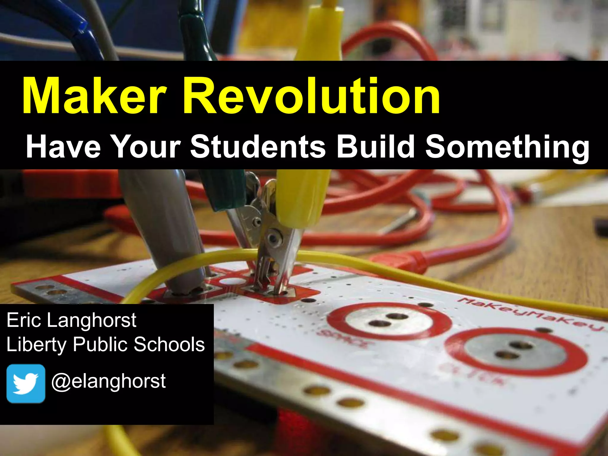 The document discusses the maker revolution in education, emphasizing the importance of maker culture as a technology-based extension of the DIY movement, which encourages invention and practical skills. It references various resources and tools like Makey Makey, Hour of Code, and Raspberry Pi to facilitate hands-on learning. The author, Eric Langhorst of Liberty Public Schools, advocates for integrating these technologies into the classroom to inspire creativity among students.
