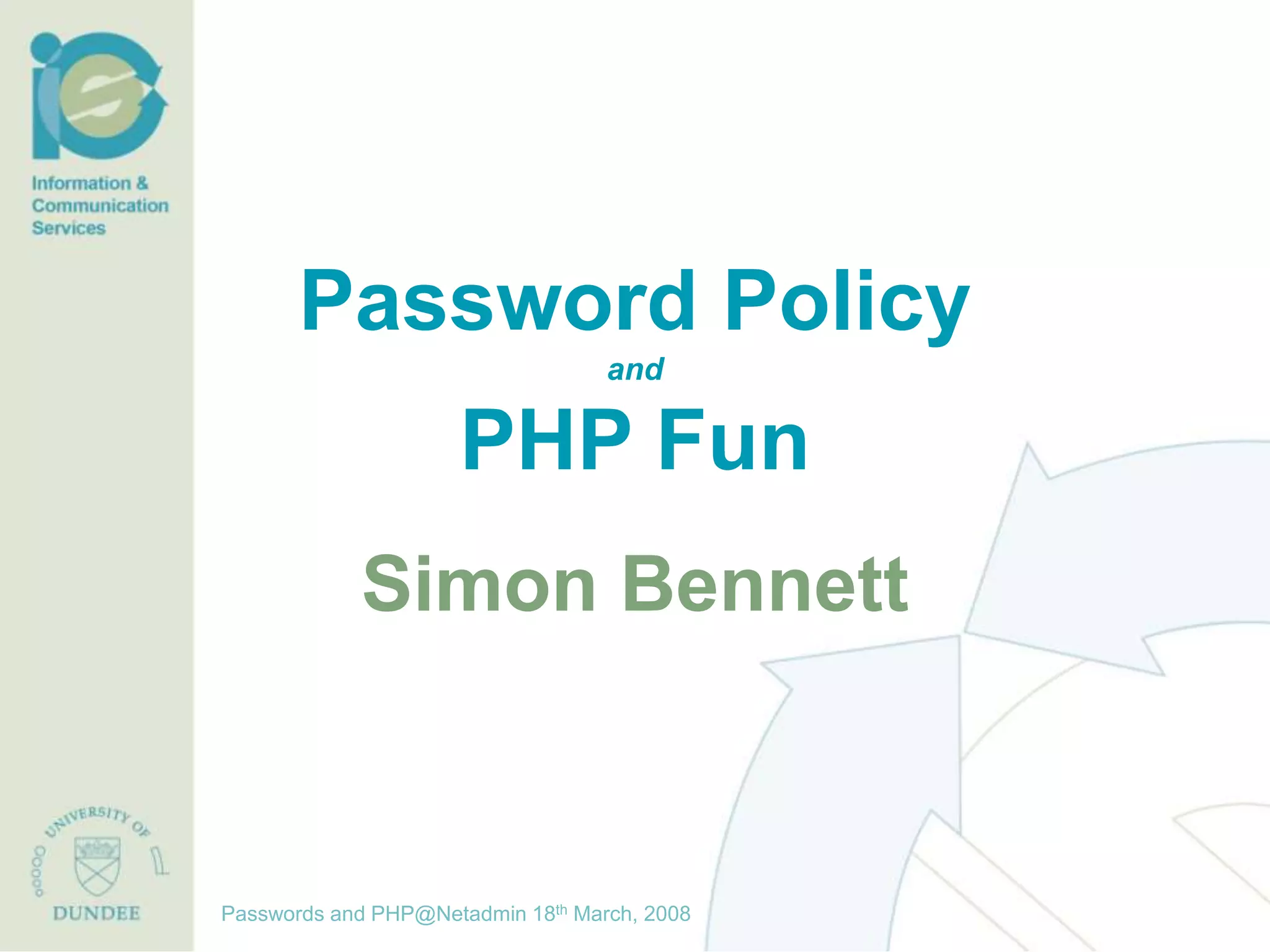 The document discusses two topics: a new university password policy and fun with PHP. The password policy summary points include yearly password changes, minimum length of 6 characters including two digits or punctuation, and locking out accounts after 5 failed attempts. The PHP section provides a brief history and overview of PHP, noting it is a powerful but flexible server-side scripting language that can enable massive security holes if not coded properly. It encourages validating all user input and provides some examples of attacks seen on PHP applications.
