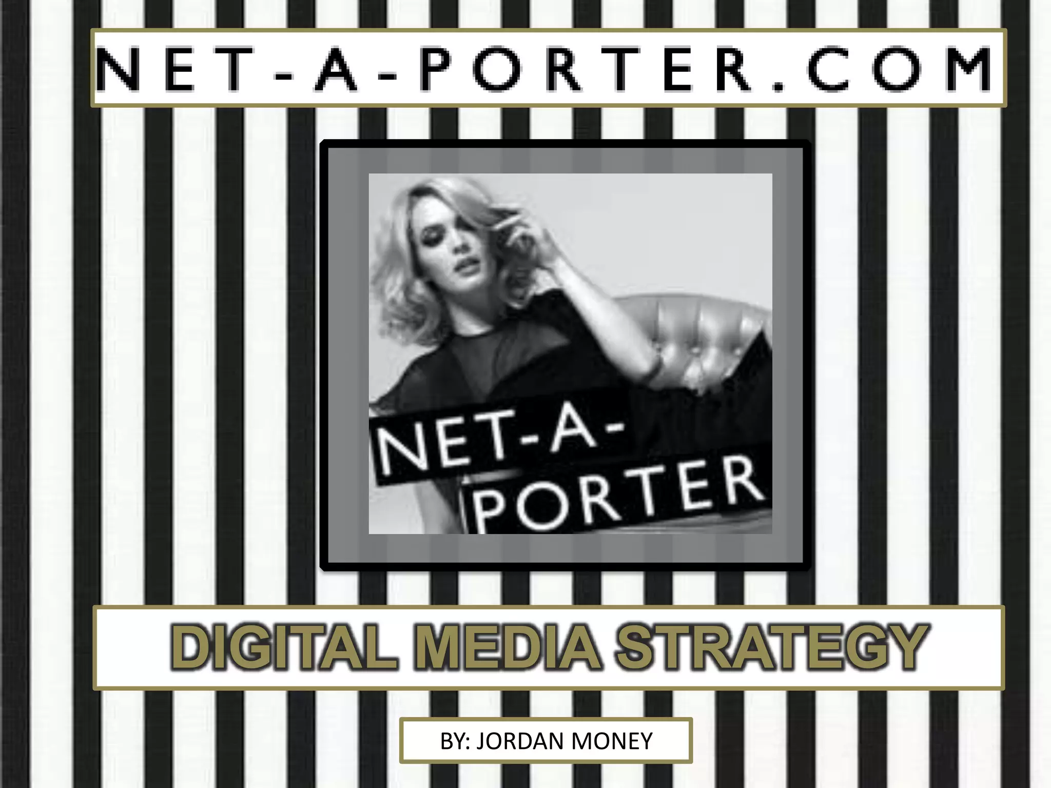 NET-A-PORTER needs to increase online sales and engagement. Their strategy is to launch a social media, Google AdWords, and mobile app campaign targeting women ages 18-34. They will create Facebook, Pinterest, and Twitter pages to share new products, sales, and contests. Google AdWords will drive traffic with keywords like "luxury clothing". A mobile app offering discounts and updates aims to boost purchases and visits from their target audience. Analytics will track results and spending is allocated over 12 months with peak periods in January to June.