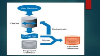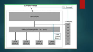 NetApp deduplication provides block-level deduplication within flexible volumes to reduce storage capacity needs. It works at the 4KB block level on active file systems and can be configured to run automatically or manually. Deduplication uses fingerprints that are unique digital signatures for blocks. During deduplication, fingerprints are compared and any duplicate blocks are replaced with a pointer to the existing data block to save space. Up to 4% additional space may be needed in a volume and up to 3% in an aggregate for deduplication metadata.