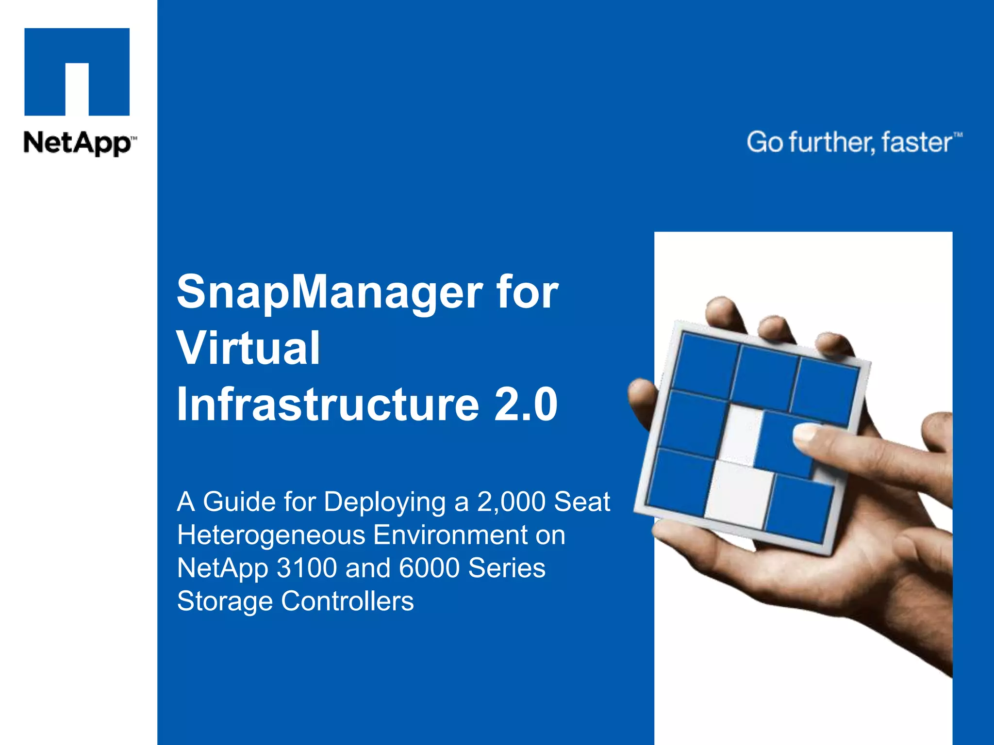 SnapManager for Virtual Infrastructure 2.0 automates snapshot-based backups and disaster recovery for virtualized VMware environments stored on NetApp storage systems. It addresses challenges of virtual infrastructures like increasing storage demands and slow traditional backups. SMVI leverages NetApp snapshot technology to provide instantaneous, storage-efficient backups and fast restores. It simplifies data protection management and improves recovery time and point objectives.