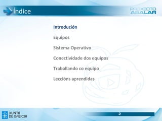 Conectividade dos equiposConexión á rede cableada do centro O Equipamento ABALAR é especificamente para as aulas ABALAR polo que non debe saír fora de ditas aulas. Sen embargo en certas circunstancias excepcionais e coa debida autorización poderíamos precisar conectar algún dos equipos á rede SIEGA do centro. As especificacións determinadas que dispoñen as redes dos centros (IP estáticas, non existe autenticación de usuarios nin de equipos,etc.), impide unha configuración automática dos equipos do proxecto ABALAR á hora de conectalos por cable ou por wifi ás redes do centro, polo que neses casos haberá que editar as conexións manualmente.