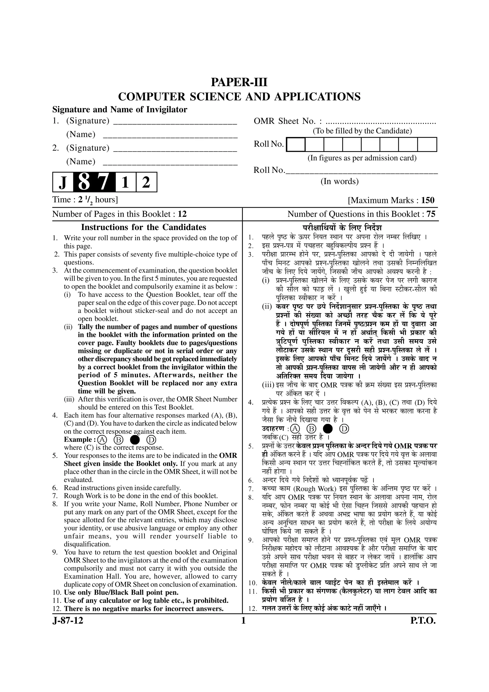 2. Students must fill in their roll number and OMR sheet number. They are instructed to carefully examine the question booklet for issues like missing pages or questions and to notify invigilators if problems are found.