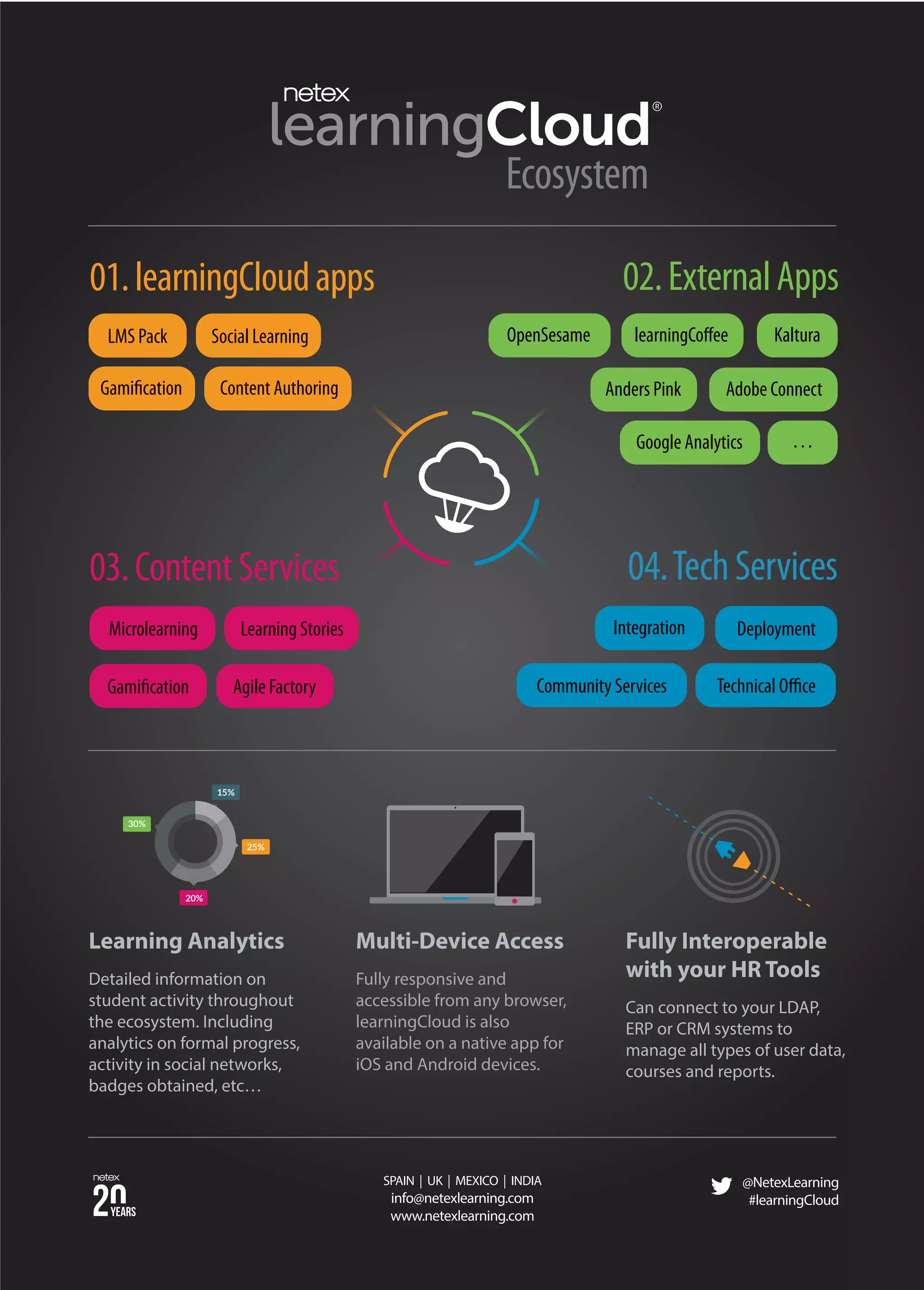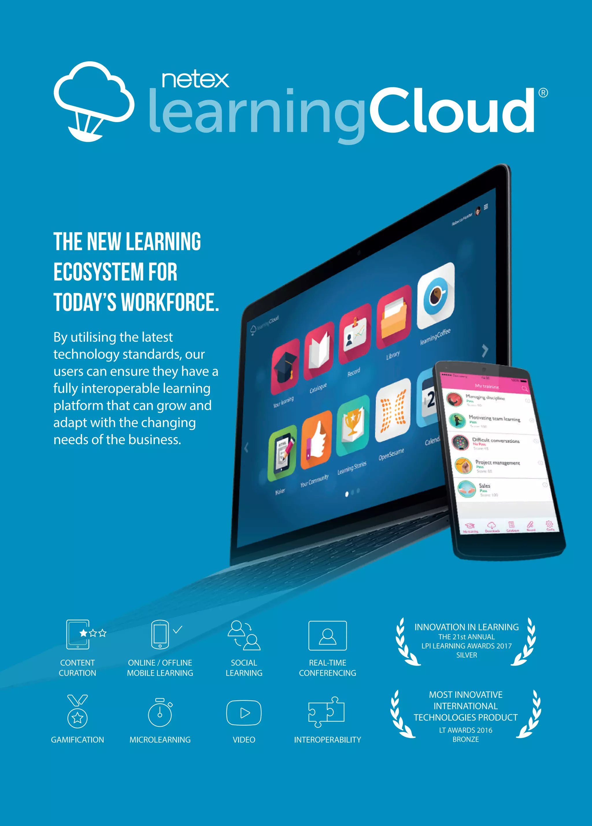 LearningCloud is an interoperable learning platform that utilizes the latest technologies to adapt to changing business needs. It provides gamification, microlearning, social learning capabilities and integrates with external apps and content services. LearningCloud also offers learning analytics, multi-device access and interoperability with HR tools.