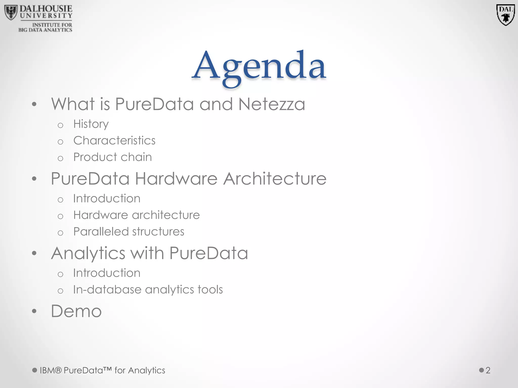 The document discusses IBM PureData System for Analytics, which is powered by Netezza technology. It provides an overview of PureData and Netezza, the PureData hardware architecture using S-Blades and FPGA technology for parallel processing, and analytics capabilities with PureData like in-database tools.