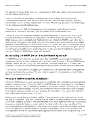 The document provides instructions for loading a large volume of master data into IBM InfoSphere Master Data Management Server (MDM Server) using the maintenance services batch approach. This approach loads data using MDM Server maintenance transactions invoked by the batch processor. The summary includes: