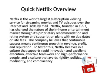 Netflix has created a culture that fosters innovation through freedom and responsibility. They avoid rigid policies and focus on attracting talented employees. Netflix values impact, courage, judgment, communication, passion, honesty and selflessness. While their culture of autonomy has led to success, they may need more structure and policies as the company expands globally to prevent legal issues and ensure cultural replication. Netflix's continued growth relies on anticipating new customer demands through constant innovation.