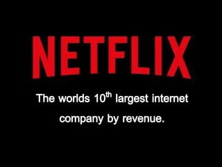 Netflix was founded in 1997 in Scotts Valley, California by Reed Hastings and Marc Randolph as a DVD mailing service and later transitioned to an online streaming service. In 2007, Netflix launched streaming video and began producing original content like House of Cards in 2013. Reed Hastings remains the CEO as Netflix has grown to over 118 million subscribers globally by 2018 and become worth over $100 billion focusing on expanding its library of original content.