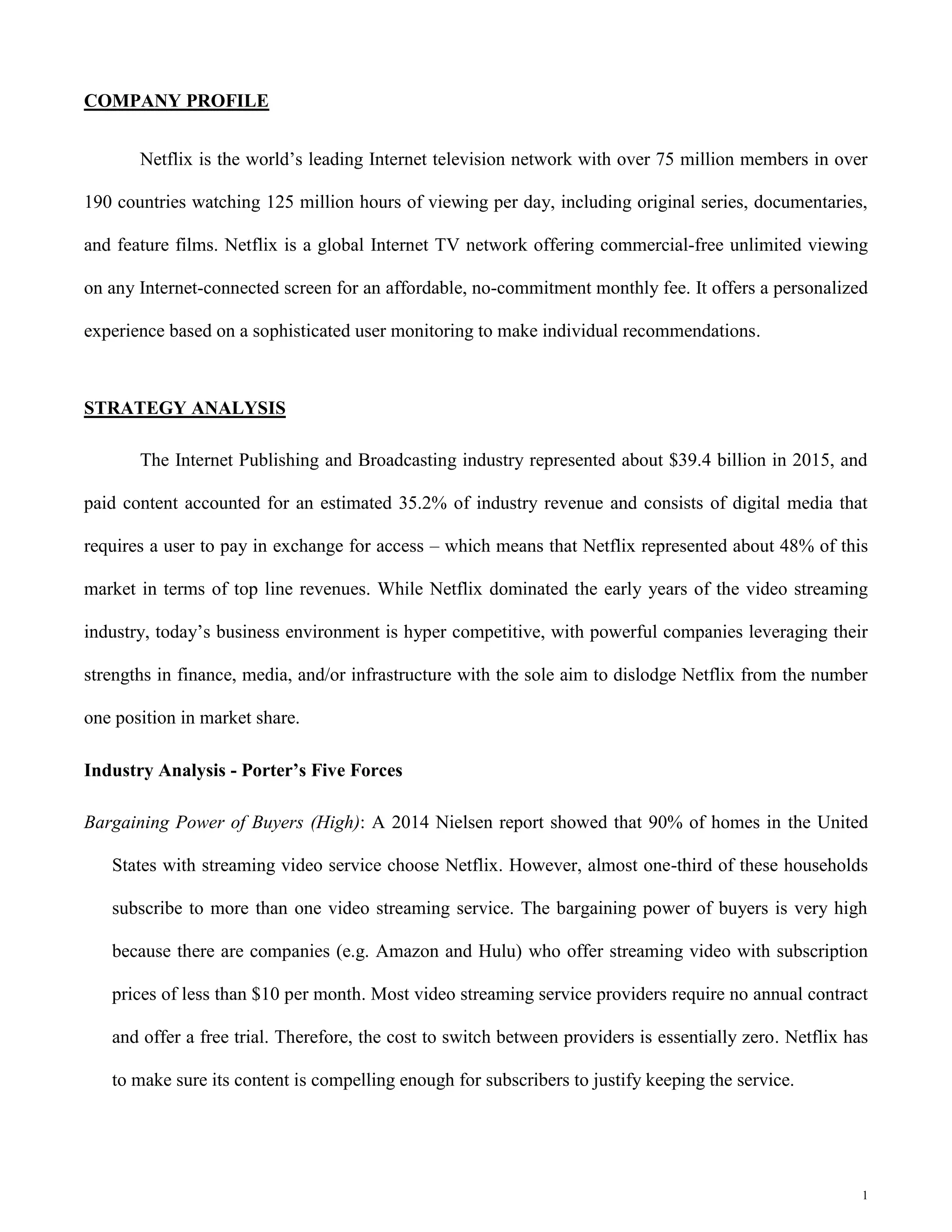 Netflix is a leading internet television network with over 75 million members globally and significant market share in the competitive streaming industry. The company's strategy focuses on content differentiation and international expansion, while also facing challenges such as high competition, supplier power, and evolving consumer preferences. Despite recent growth, Netflix anticipates slower subscriber growth in the U.S. and must continue to manage the costs associated with content acquisition to maintain profitability.