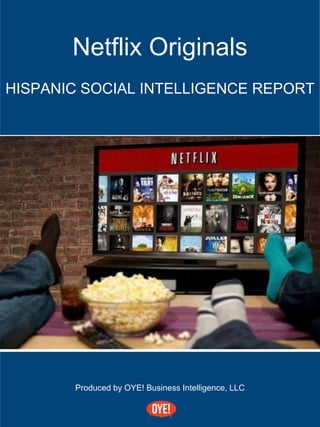 OYE! is a natural language processing solution that analyzes social media conversations in English, Spanish and Spanglish to provide insights about Hispanic consumers to brands. It can identify key details about how audiences discuss brands and provide recommendations to create targeted campaigns. The report analyzed over 10,000 Hispanic conversations about Netflix Original dramas between February and March 2016. It found that Narcos and Orange is the New Black had the highest proportions of Hispanic mentions, while conversations were mostly in Spanish. Sentiment was most positive for Crouching Tiger, Hidden Dragon: Sword of Destiny, while Narcos saw the most negative comments. Discussions were heavily concentrated in New York, Los Angeles, Miami, Chicago and Houston.