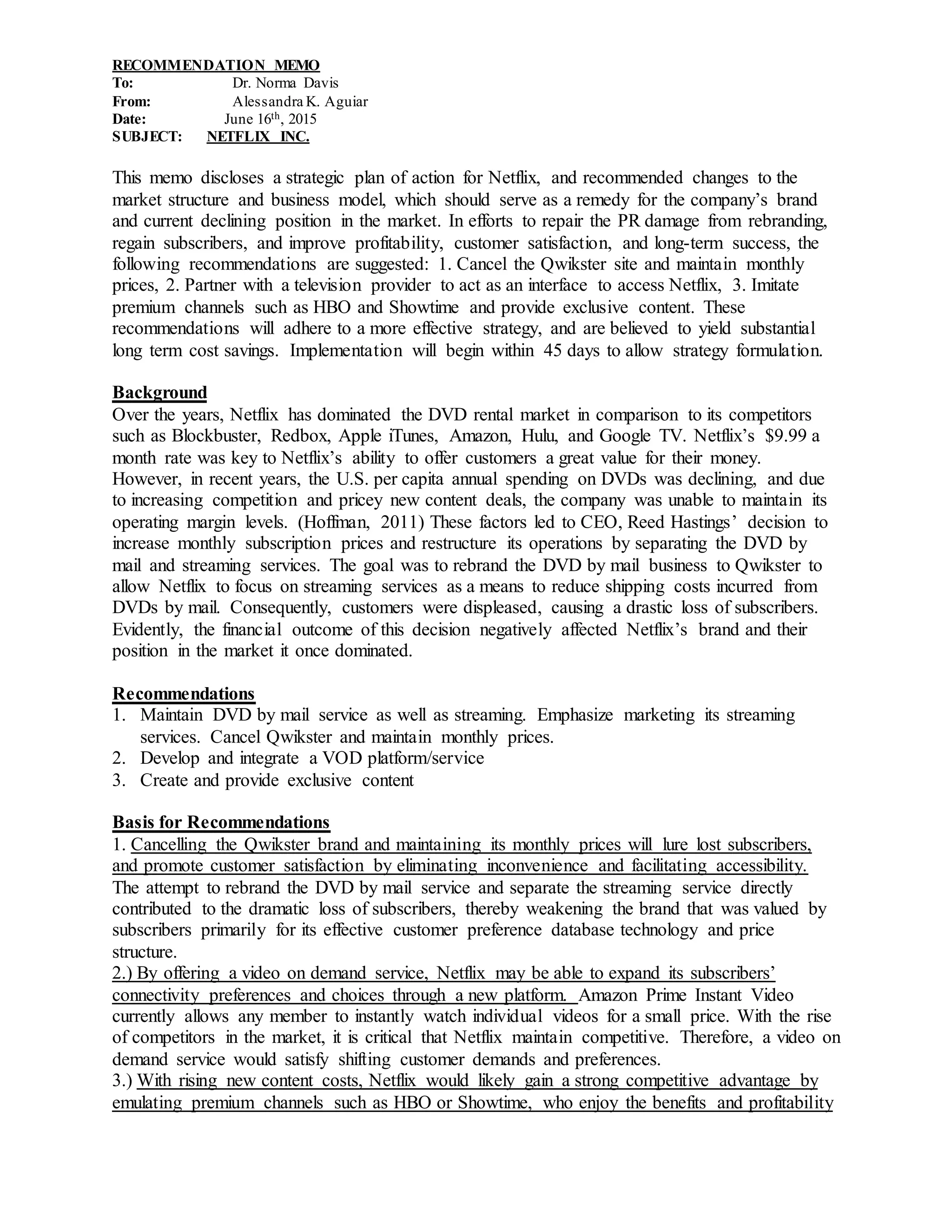 The memo recommends that Netflix cancel its plan to separate its DVD and streaming services into different brands (Qwikster and Netflix). It suggests that Netflix maintain its DVD and streaming services together under the Netflix brand and at the same monthly price to regain lost subscribers. It also recommends that Netflix develop a video-on-demand platform and provide exclusive original content to differentiate itself from competitors. Implementing these recommendations would adhere to a strategy of cost leadership and differentiation to improve Netflix's competitive position in the market.