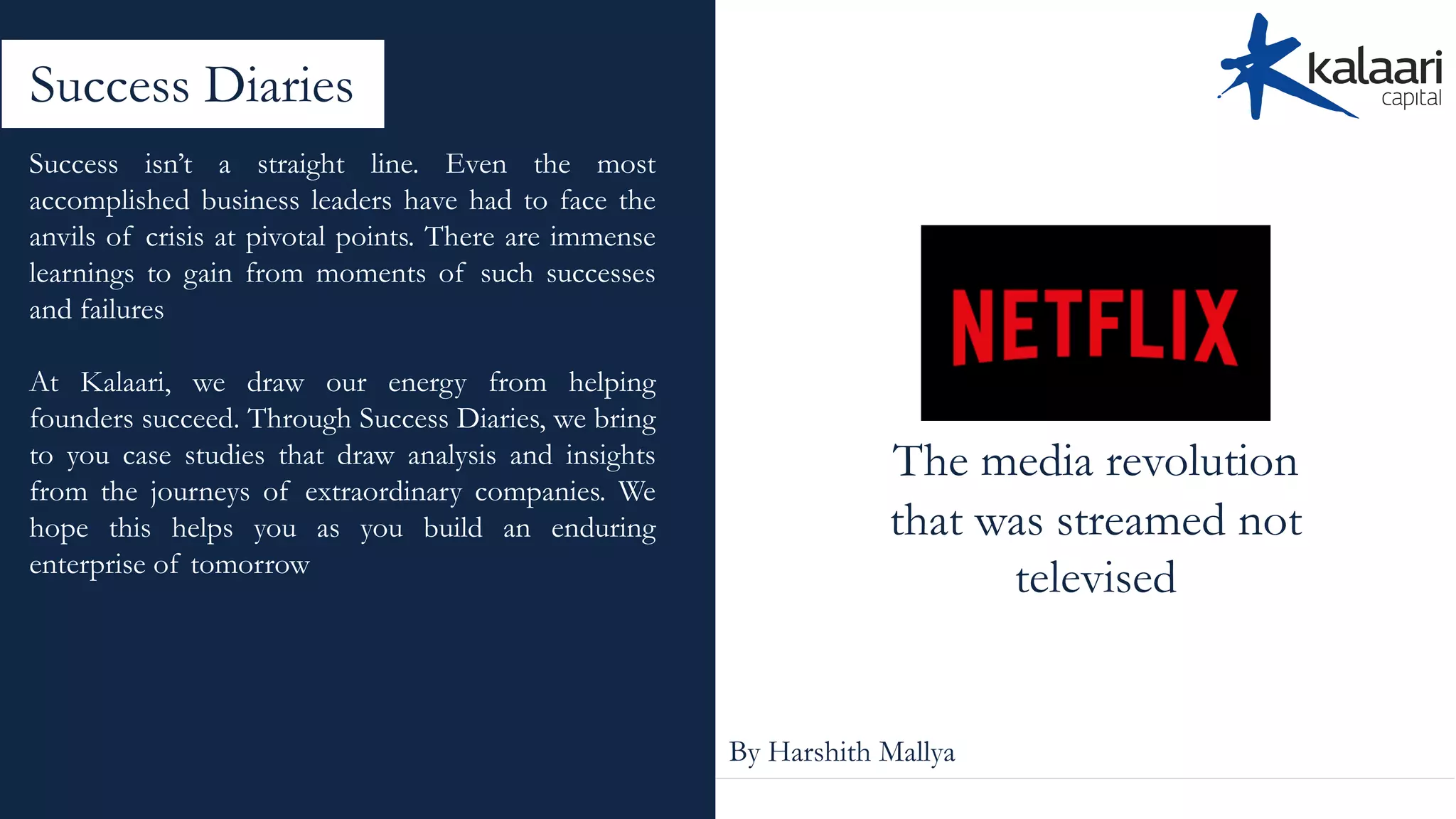 The document summarizes key learnings from the success of Netflix. It discusses how Netflix transitioned from DVD rentals to online streaming and original content production through first principle thinking. It highlights how Netflix builds talent density and promotes radical candor through open feedback. The summary emphasizes that Netflix empowers employees through decentralized decision making and prioritizes innovation for the long term through personalization and data-driven recommendations.