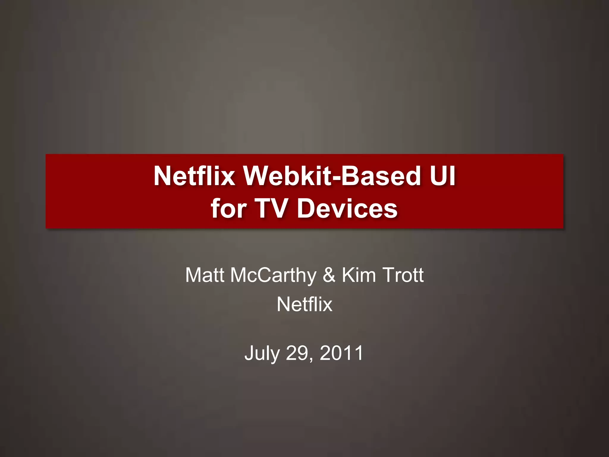 The document discusses the implementation of a WebKit-based user interface for Netflix on TV devices, highlighting the differences between 2-foot and 10-foot UI designs. It addresses engineering challenges related to performance, memory management, and user input handling, along with strategies for enhancing responsiveness and optimizing scrolling performance. Additionally, it emphasizes the importance of leveraging hardware capabilities and accelerated compositing for improved visual effects and performance on various devices.