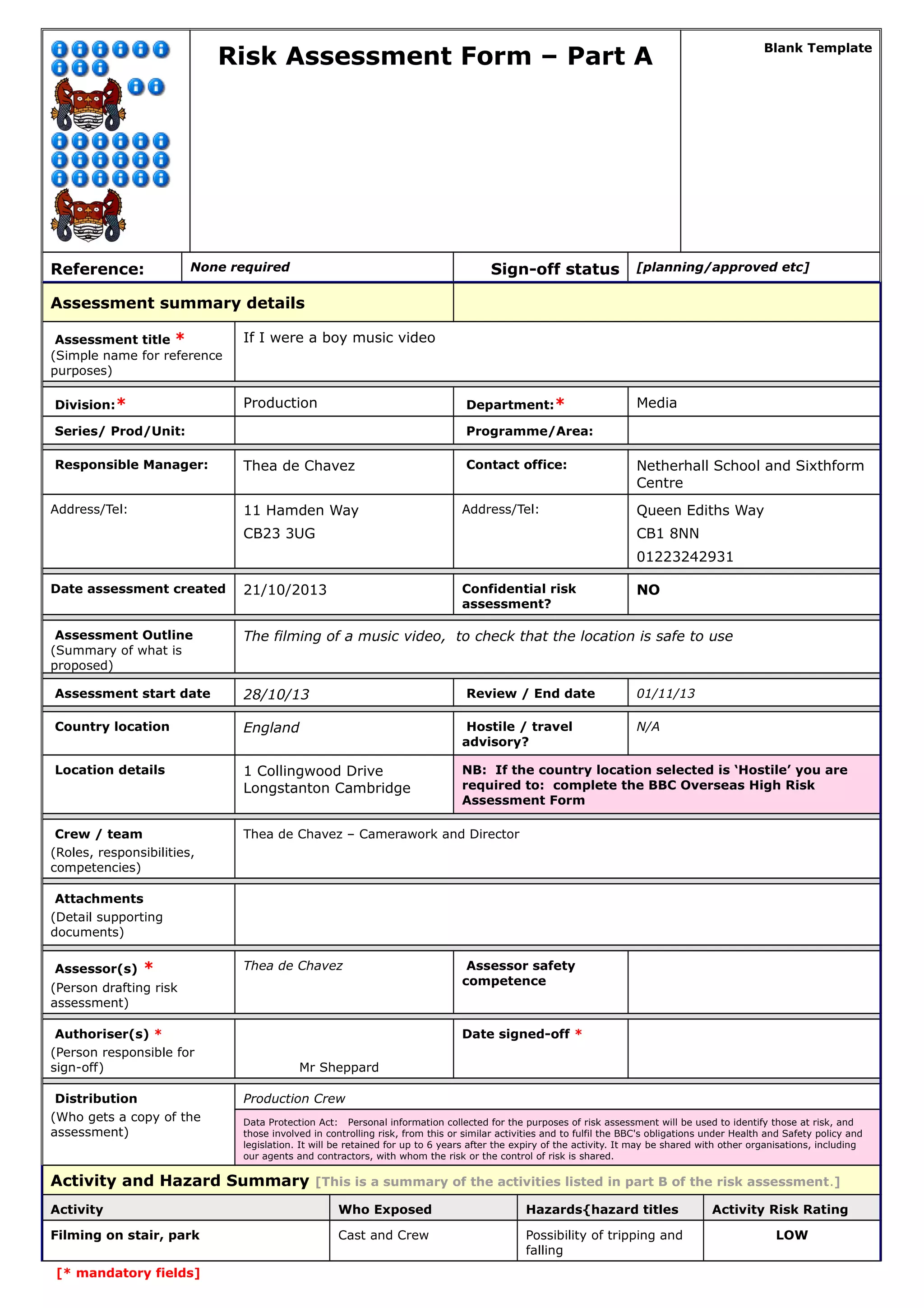 This risk assessment form summarizes the filming of a music video at two locations - stairs and a park in Longstanton, Cambridge, England. The director and camera operator, Thea de Chavez, will oversee a crew of 4-5 people. Hazards identified include tripping or falling down the stairs, and falling from park equipment. Controls will involve frequently checking steps and clear tripod placement, as well as instructing cast to be careful and know their limits on park activities. The overall risk level is assessed as low after applying these controls.