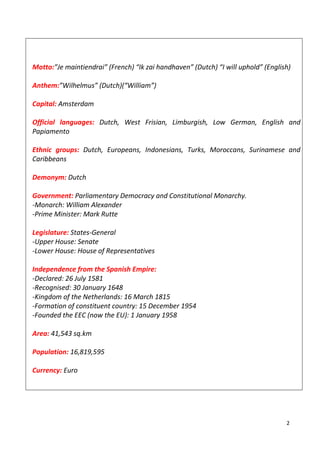 The Netherlands is a country located in Western Europe, bordering Germany, Belgium and the North Sea. It has a population of over 16 million people and its capital and largest city is Amsterdam. The Netherlands has a highly developed economy and was a founding member of the EU. It has a constitutional monarchy government and a history of trade and global influence dating back centuries.