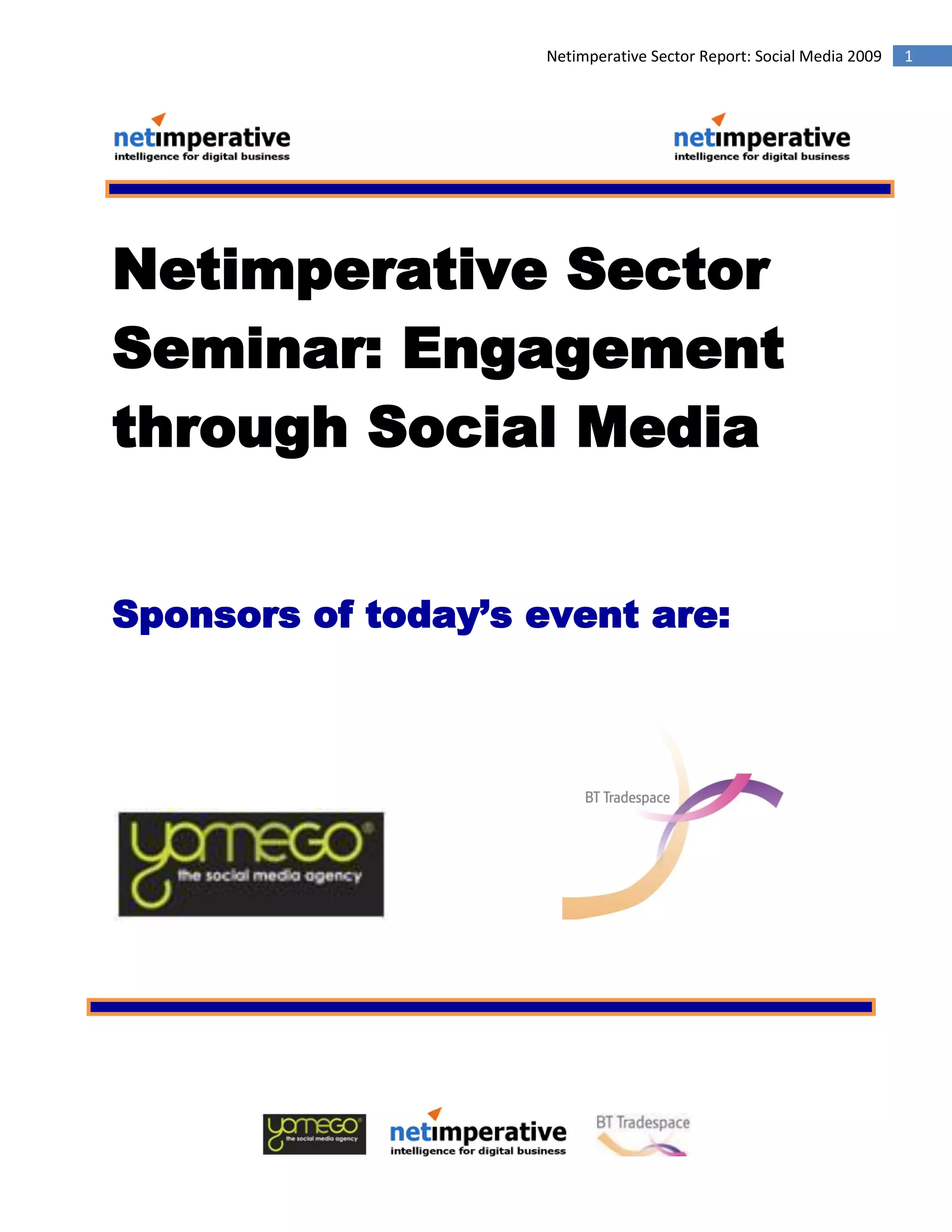 This document provides an overview of the social media sector in 2009. It discusses how social media has grown significantly and become a major part of online activity, with people now spending more time on social networks than email or porn sites. While this growth presents opportunities for marketers, it also poses challenges as consumers expect more control over their media and are able to widely share their opinions. The document then reviews popular social media platforms and provides statistics on Facebook's dominance in the UK market.