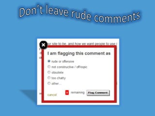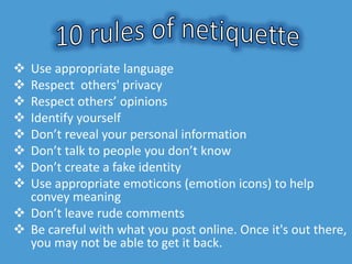 The document outlines guidelines for appropriate online communication, emphasizing respect for privacy, opinions, and proper language use. It advises against revealing personal information, using rude comments, and creating fake identities while stressing the importance of good grammar and careful posting. The document also highlights the permanence of online posts and suggests using salutations and signatures in messages.