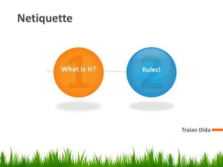 The document discusses netiquette, which are rules for proper online behavior. It defines netiquette as a set of rules for behaving properly online. It then lists six netiquette rules: 1) remember the human by treating others with respect and kindness online as you would in person, 2) apply the same standards of ethics, legality and morality online as offline, 3) consider your audience and ensure what you post is appropriate for the context, 4) respect others' time and bandwidth by being considerate of how much content you share, 5) present yourself professionally online through your words and knowledge, and 6) share your expertise and experience to help others.