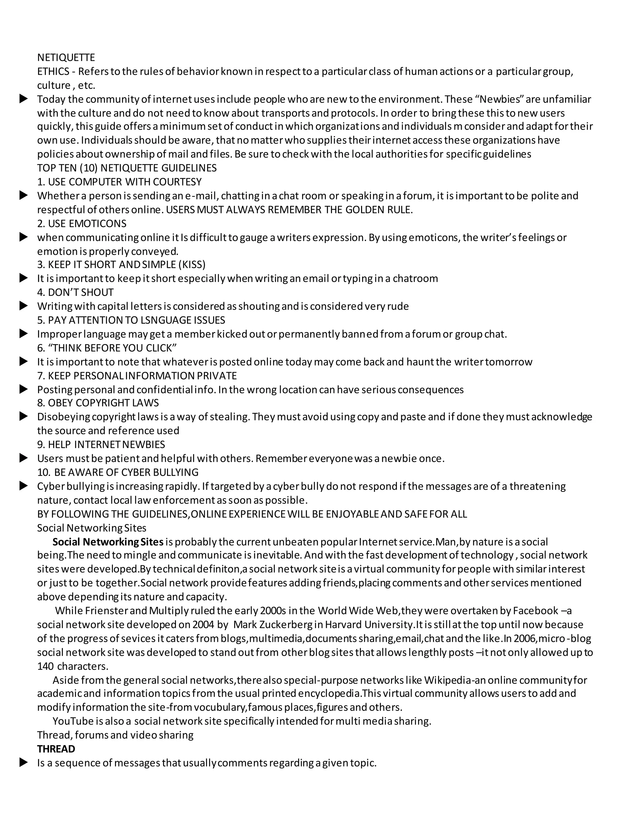 This document provides guidelines for proper online etiquette and behavior, known as netiquette. It discusses ethics and conduct for internet users, particularly new users. The top ten netiquette guidelines include being polite, using emoticons, keeping messages short and simple, avoiding shouting, paying attention to language, thinking before posting, keeping personal information private, obeying copyright laws, helping new users, and being aware of cyberbullying. Following these guidelines will help create a safe and enjoyable online experience for all.