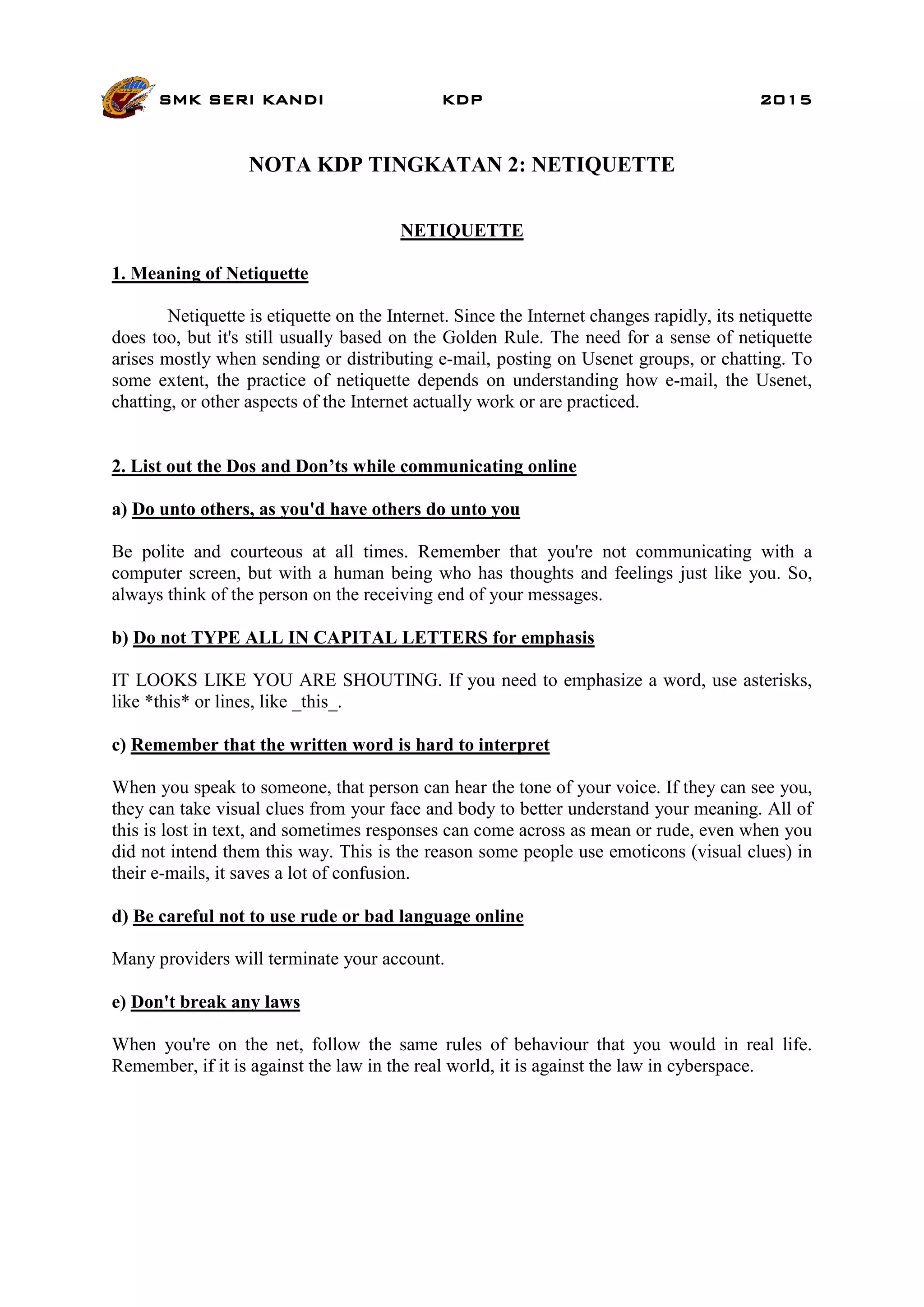 Netiquette refers to etiquette on the Internet and provides guidelines for polite and appropriate online communication. The document lists several dos and don'ts of netiquette, including being polite, avoiding all capital letters, using emoticons to convey tone, keeping messages brief, identifying yourself, and being patient with newcomers. It also advises avoiding spamming, flaming, and using emoticons wisely in online interactions. Adhering to netiquette helps ensure respectful and productive communication.