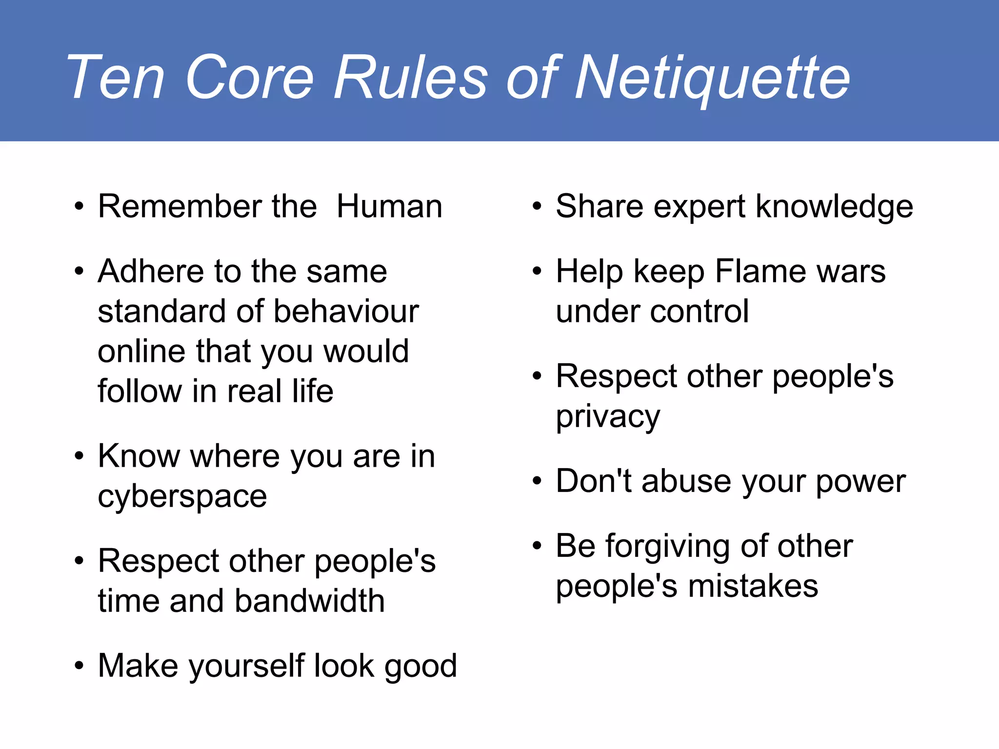 The document outlines ten core rules of netiquette and online conduct, emphasizing respect, clear communication, and the need to treat online interactions as real-life ones. It highlights the importance of community understanding, sharing knowledge, and being considerate of others' time and privacy. Additionally, it advises on avoiding power abuse and encourages forgiveness for mistakes made by less experienced users.