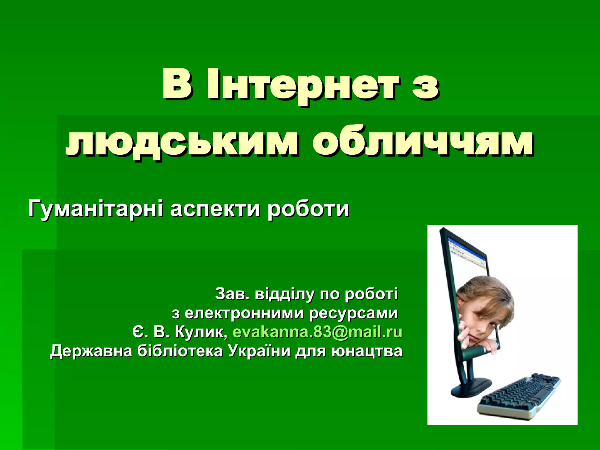 В Інтернет злюдським обличчям Гуманітарні аспекти роботи Зав. відділу по роботі з електронними ресурсами Є. В. Кулик, [email_address] Державна бібліотека України для юнацтва