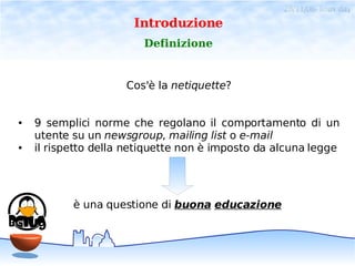 Il documento discute la netiquette, ovvero le norme di comportamento da seguire in newsgroup, mailing list e e-mail. Vengono illustrate nove regole fondamentali per una comunicazione rispettosa e chiara online, alcune delle quali riguardano l'uso corretto di e-mail e la gestione delle risposte. Si sottolinea l'importanza della sintesi, del rispetto degli argomenti e della corretta citazione nei messaggi inviati.
