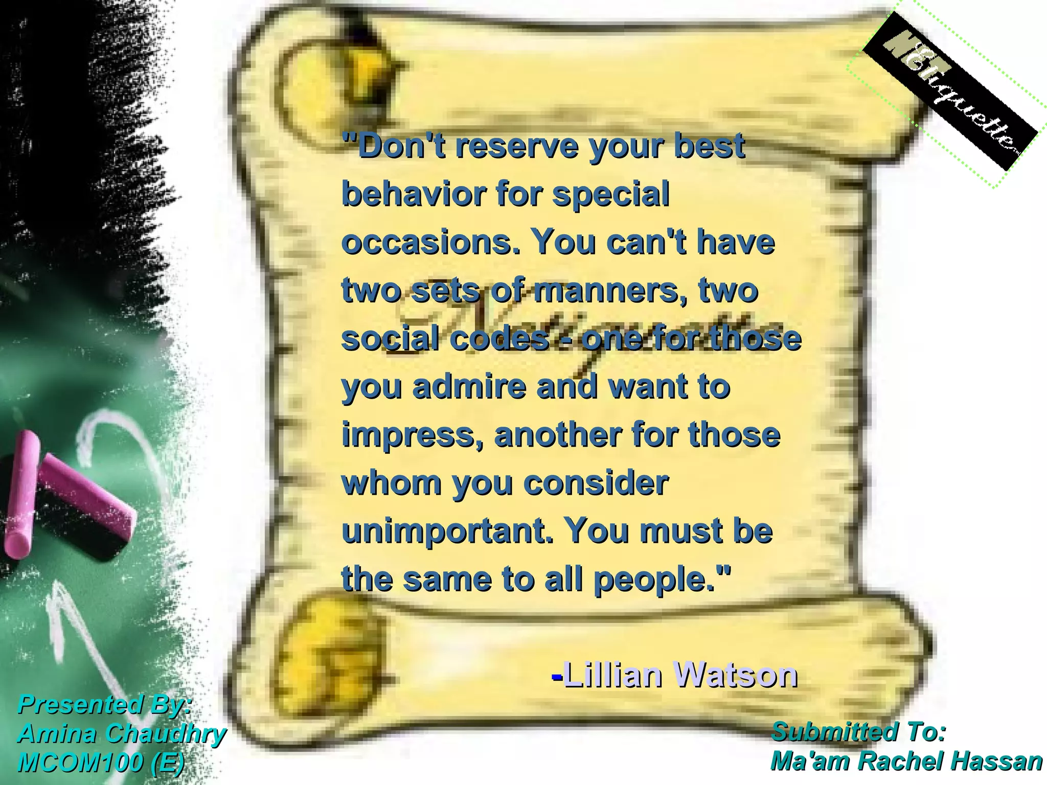 The document provides guidance on proper online behavior and etiquette. It recommends treating all people, whether important or unimportant, with the same level of respect and manners. Specifically, it advises not reserving your best behavior just for special occasions or people you want to impress, but instead maintaining consistent social codes and manners with everyone.