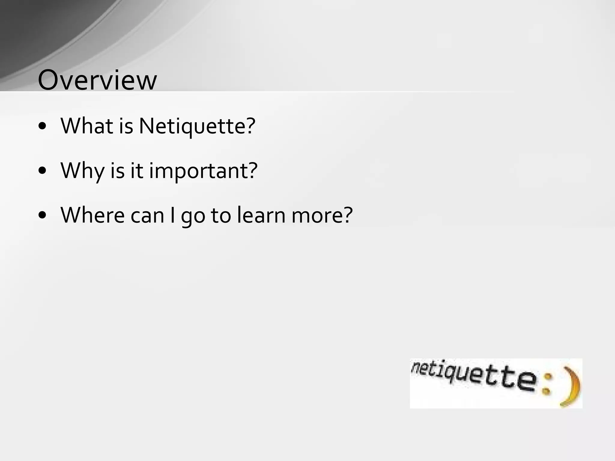 Netiquette, short for internet etiquette, encompasses the guidelines for appropriate online communication to ensure sensitivity to others' feelings. It is crucial in today's digital interactions to prevent misunderstandings, as messages can easily be misinterpreted. Additional training and resources for learning about netiquette are available online.